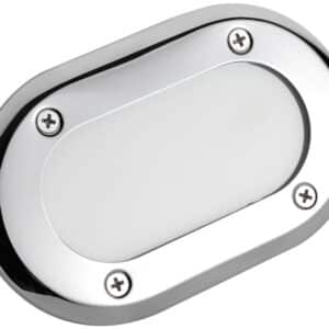 - Polycarbonate frame with mirror-polished stainless steel ring.