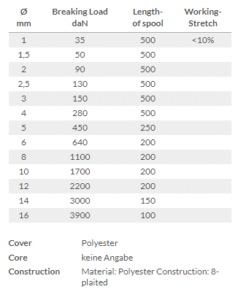 • working stretch < 10% • will not stiffen up • very UV resistant • flexible • abrasion resistant • custom lengths available