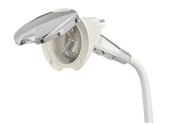 Flush installation in transom or deck only requires a Ø 70 mm hole, easily done with a hole saw. The housing requires minimal depth for installation and accepts most existing shower heads.