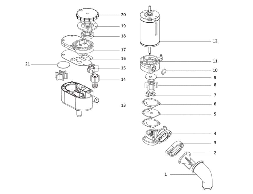 – Self priming up to 0. 6m(2ft). – Waste pump discharges over an anti syphon loop up to 1.8m (6ft) and through hull fitting 0.9m(3ft) below the surface. – Typical power consumption is less than 1.0 amp hour(12 volt) or 0.5 amp hour (24 volt) per day. |